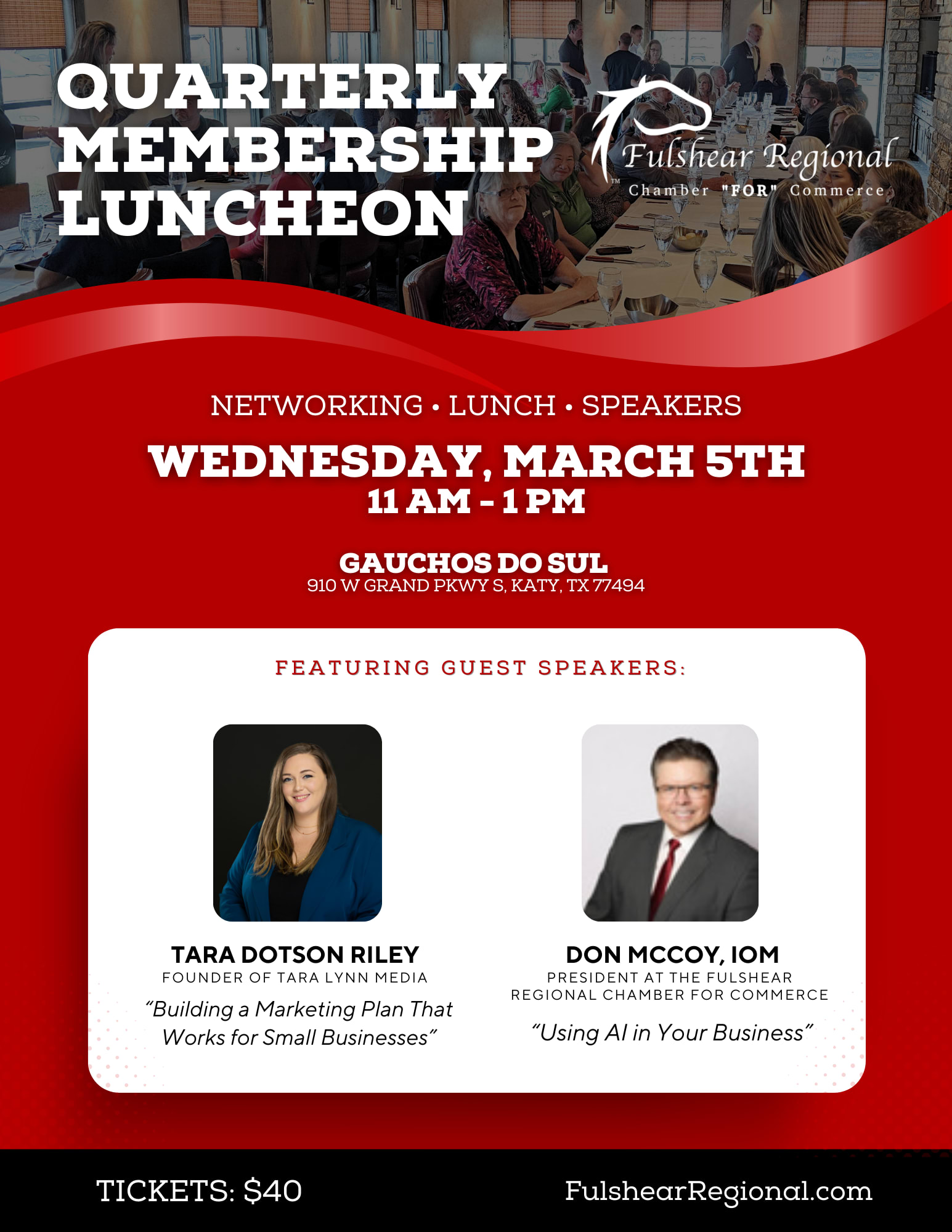 Join us for the Fulshear Regional Chamber FOR Commerce’s Quarterly Membership Luncheon, where connections are made, insights are gained, and inspiration abounds!