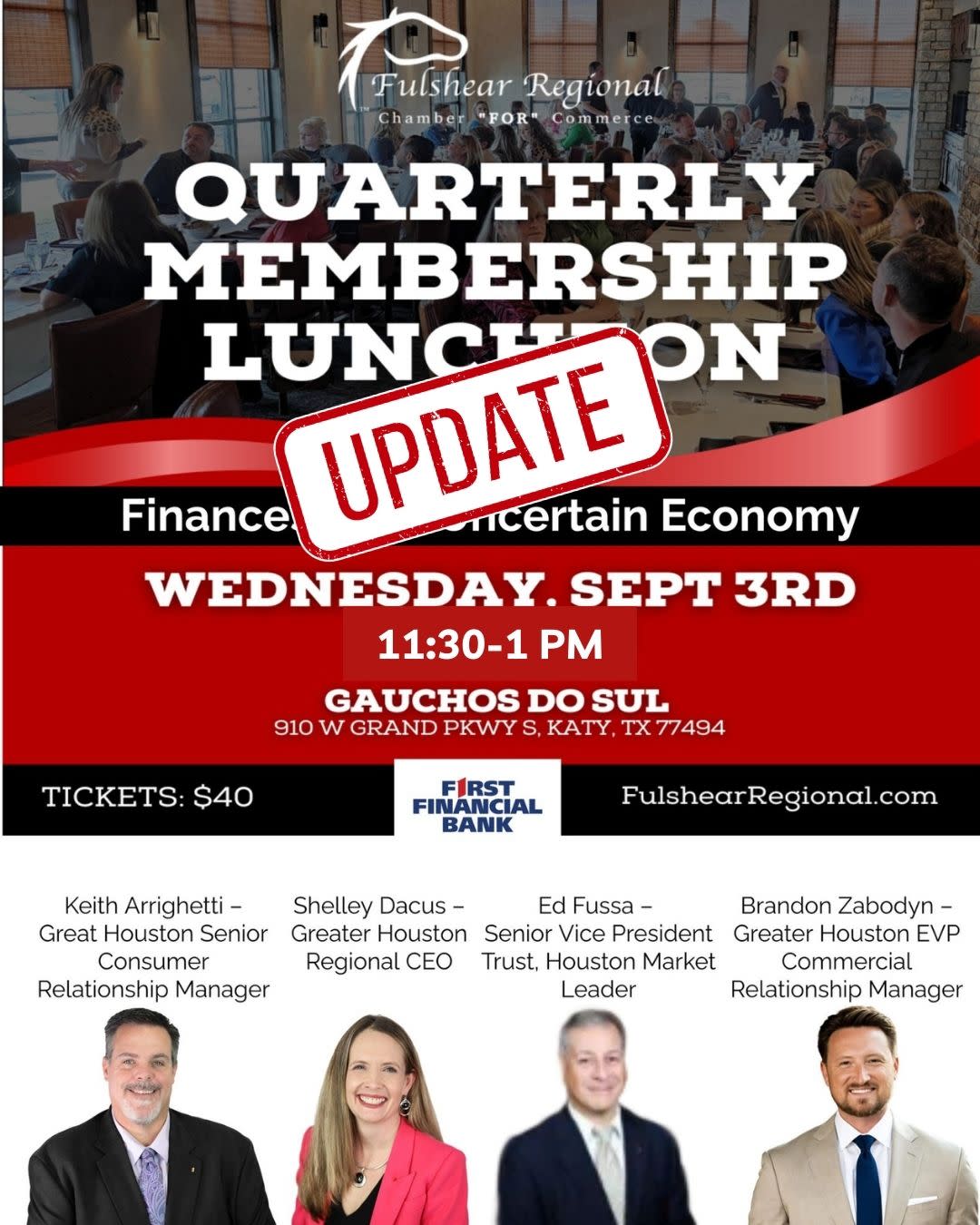 Join the Fulshear Regional Chamber for Commerce Quarterly Membership Luncheon on Wednesday, September 3rd, from 11:30 AM – 1 PM at Gauchos Do Sul, where we’ll tackle the timely topic of Finances in an Uncertain Economy