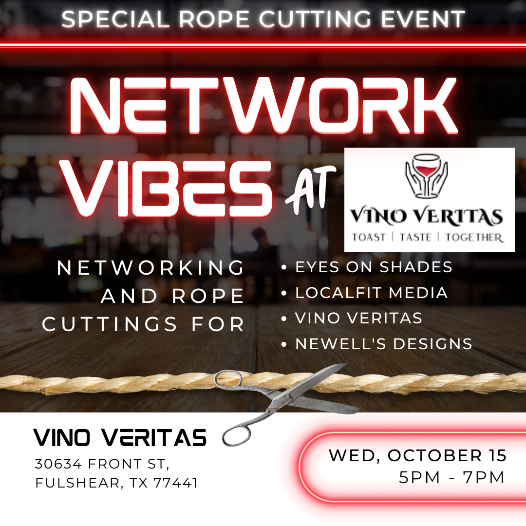 Please join us for another great Network Vibes at Vino Veritas. This will also be a Rope Cutting Ceremony for Eyes on Shades, LocalFit Media, Vino Veritas, and Newell's Designs. Don't miss out!. Don't miss out!