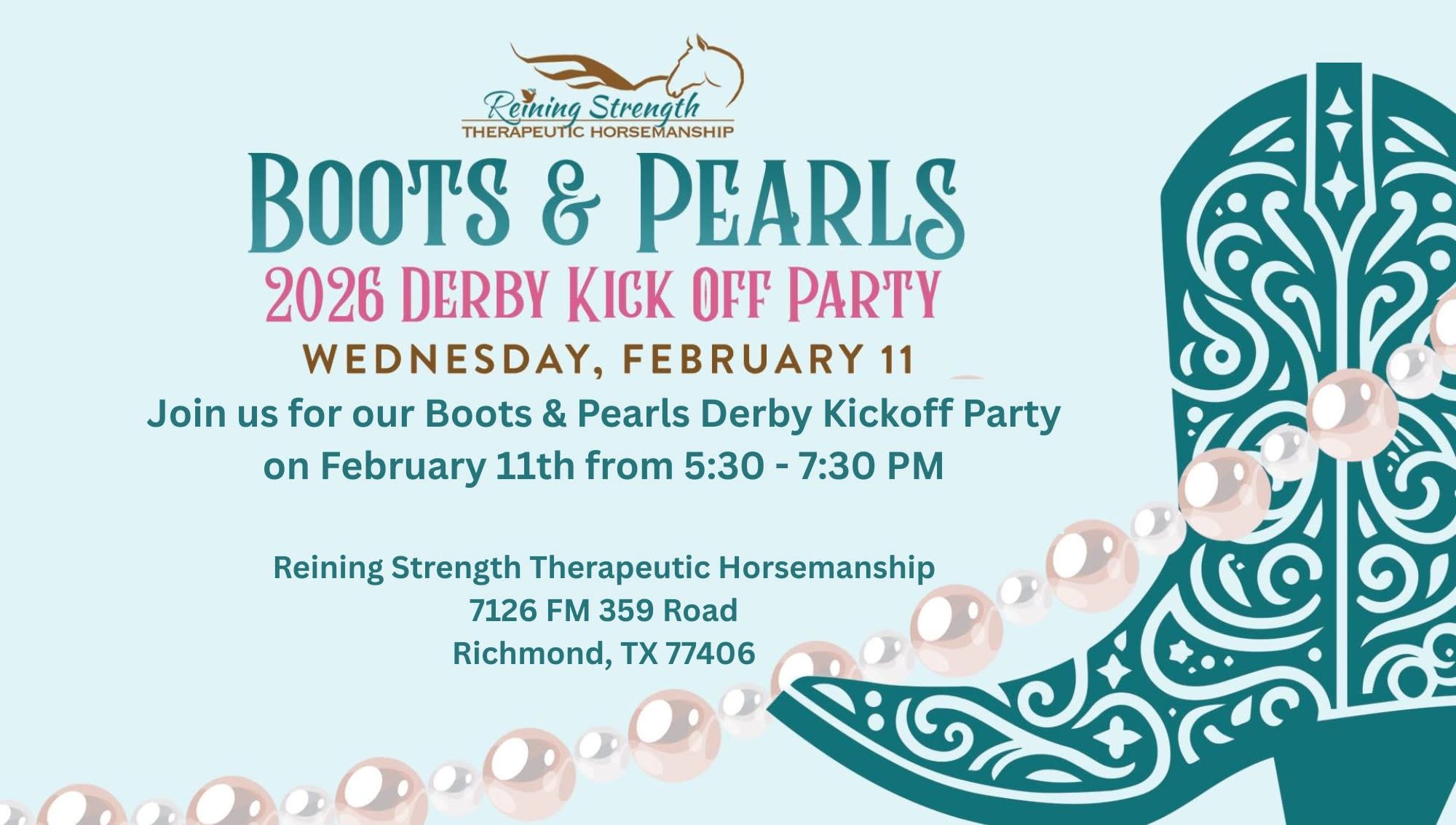Join us for our Boots & Pearls Derby Kickoff Party on February 11th from 5:30 - 7:30 PM at Reining Strength. New & fun experiences: Pony Poop Bingo His & Hers Valentine's silent auction items Derby Hat Auction Signature Kentucky Oaks Lily Cocktail Photo Ops with our horses Boot Shine Stations Delicious bites & more! No ticket required to attend! Please consider bringing an auction item, gift cards, or a bottle of whiskey or wine valued at least $40 to help us prepare for May's Derby Day Party. This party is going to be one for the books - don't miss it!
