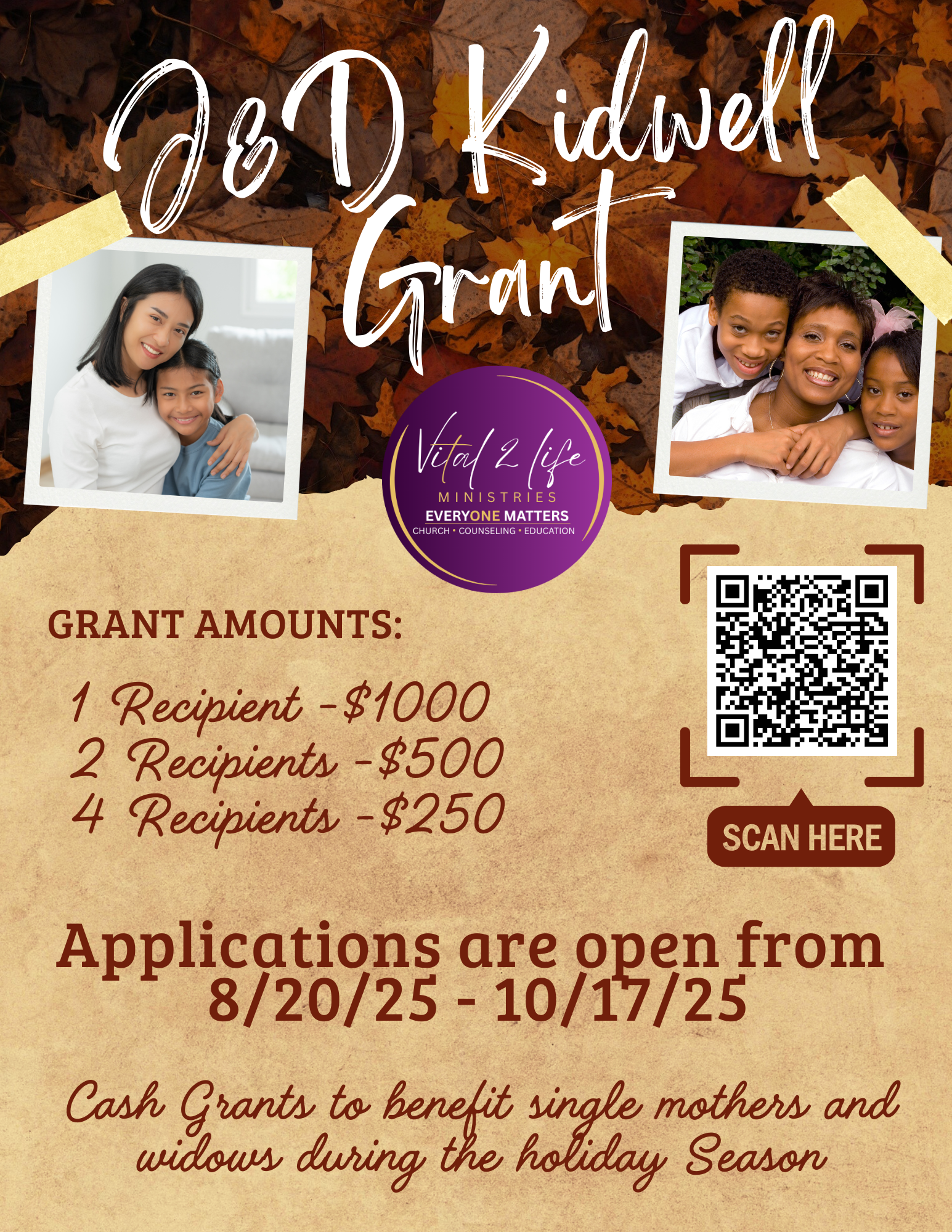 A key highlight of our mission is the annual Kidwell Grant Giveaway, which provides financial assistance to help single mothers and widows take meaningful steps toward a better future. If you are interested please fill out the application!