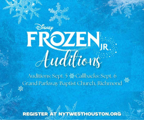 Exciting News! Join us on a magical journey and shine in our inaugural production, Disney’s Frozen, JR. Open to performers aged 8-18, this is your chance to be part of an unforgettable experience. When: September 5 & 6 Where: Grand Parkway Baptist Church, Richmond, TX Come prepared to dazzle with your talent, make lifelong friends, and bring the beloved story to life on stage! We can't wait to see you sparkle! Register at [[https://nytwesthouston.org/upcoming-shows](https://nytwesthouston.org/upcoming-shows…)Images