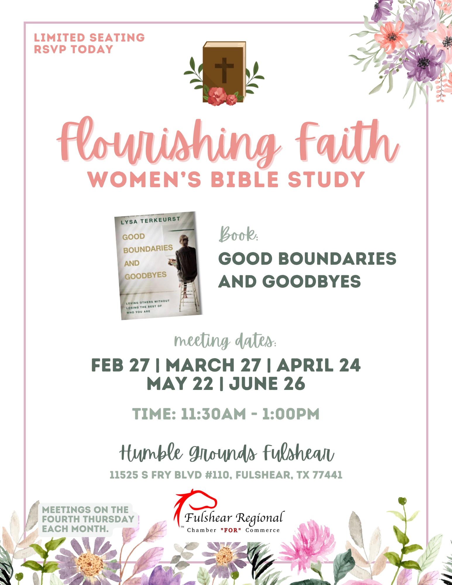 Gather with us at Humble Grounds in Fulshear, a cozy and inviting space perfect for connection and reflection. Meetings will be held monthly on the dates listed above, offering a consistent time to refresh your spirit and realign your focus.