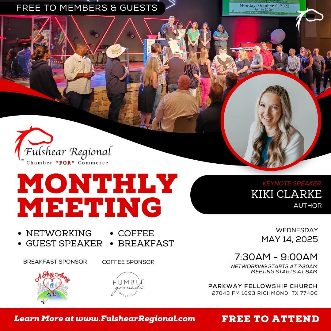 Mark your calendar for the Fulshear Regional Chamber FOR Commerce’s Monthly Meeting on Wednesday, May 14, 2025, held at Parkway Fellowship Church from 7:30 AM to 9:00 AM. This energizing event is packed with coffee, breakfast, networking, and an engaging talk by our guest speaker Kiki Clarke. Known for her vibrant energy and workplace wisdom, Kiki will present on “A Culture of Fun”—a timely and uplifting topic designed to spark innovation, boost morale, and transform team dynamics.