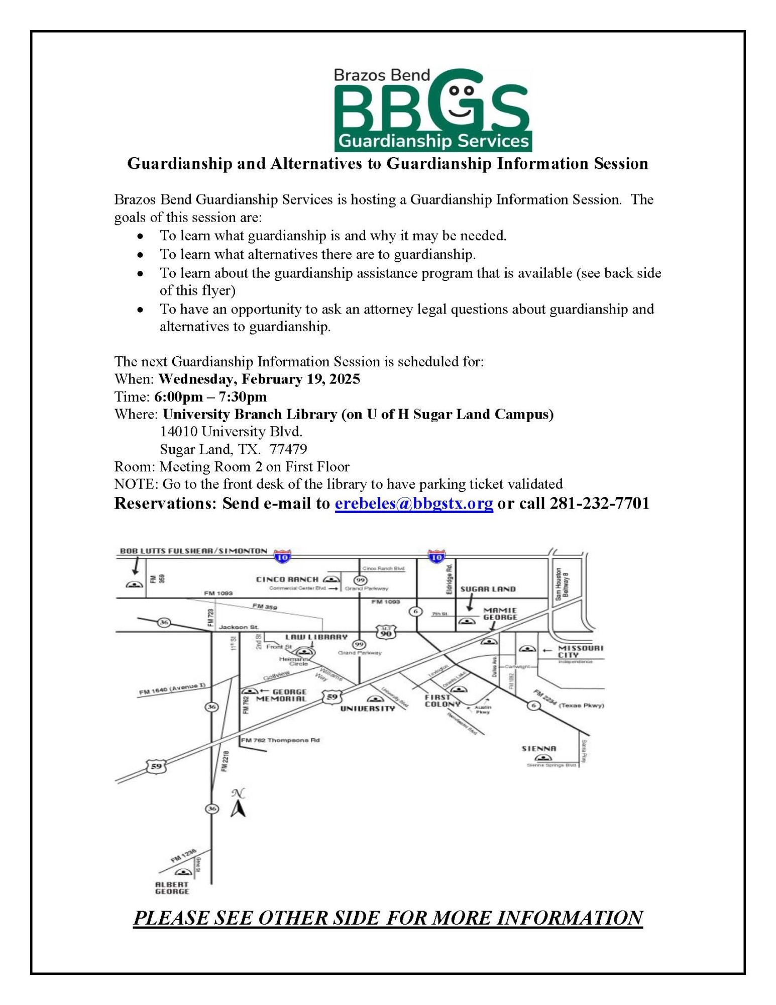 Attorney Boyd Handley and Brazos Bend Guardianship Services will present "Guardianship & Alternatives to Guardianship" at the University Branch Library. This presentation discusses the need for guardianship or one of the alternatives to guardianship at age 18 and the process involved. You'll learn about the different alternatives and the difference between full and partial guardianship plus how soon before the 18th birthday to get this process started. You'll have the opportunity to ask questions to Attorney Handley. Kirk Monroe from Brazos Bend Guardianship Services will discuss the Guardianship Financial Assistance Program and the eligibility guidelines.